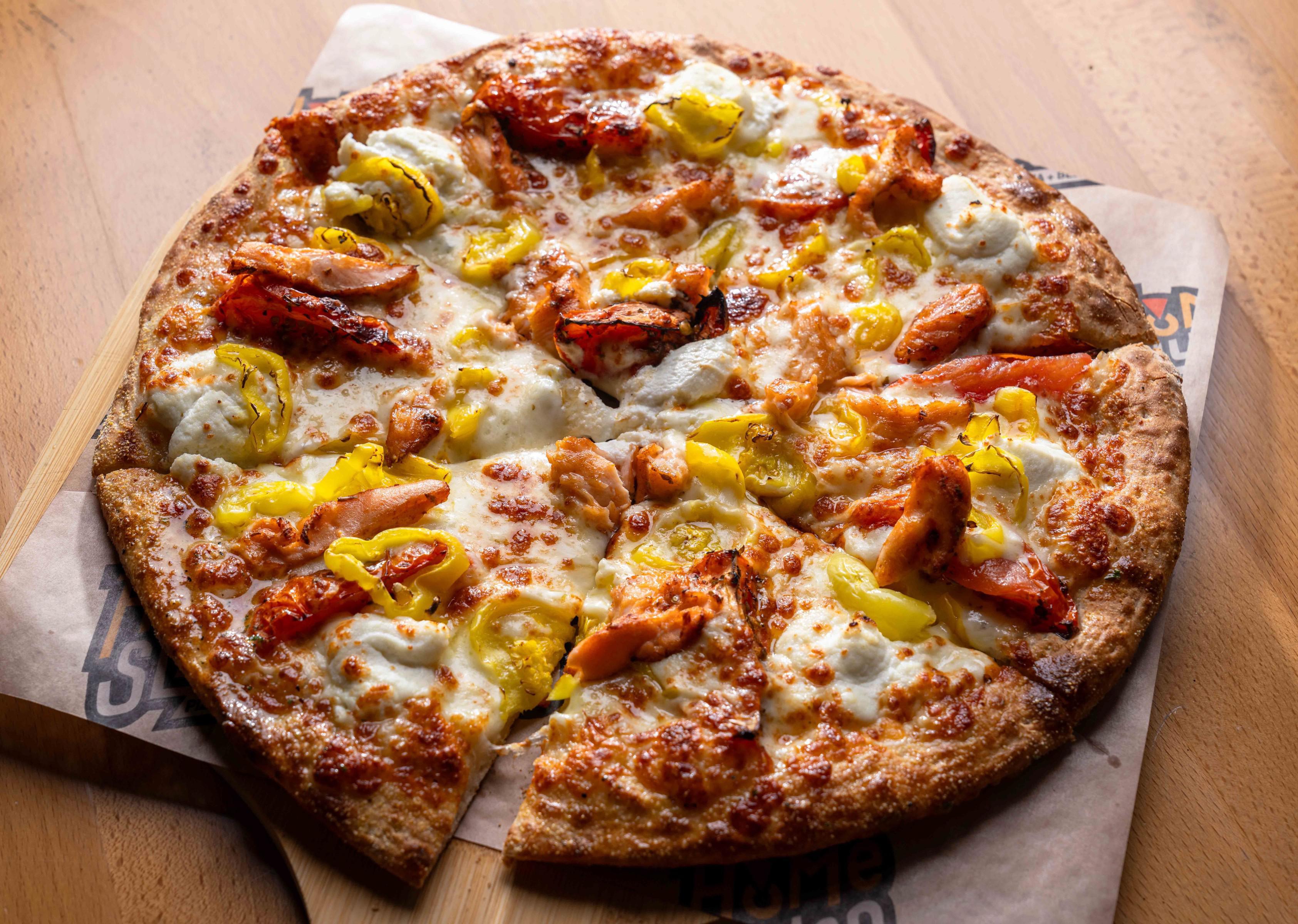 garlic butter base, salmon, banana peppers, roasted tomatoes, mozzarella & ricotta cheese