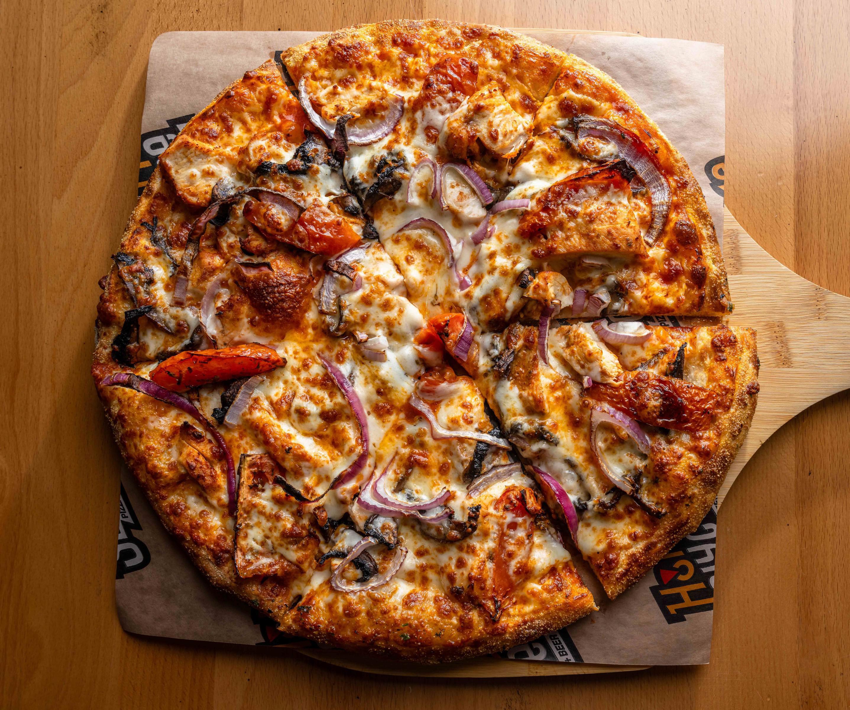 mild buffalo sauce, mozzarella cheese, spicy chicken breast, mushrooms, red onions & roasted tomatoes