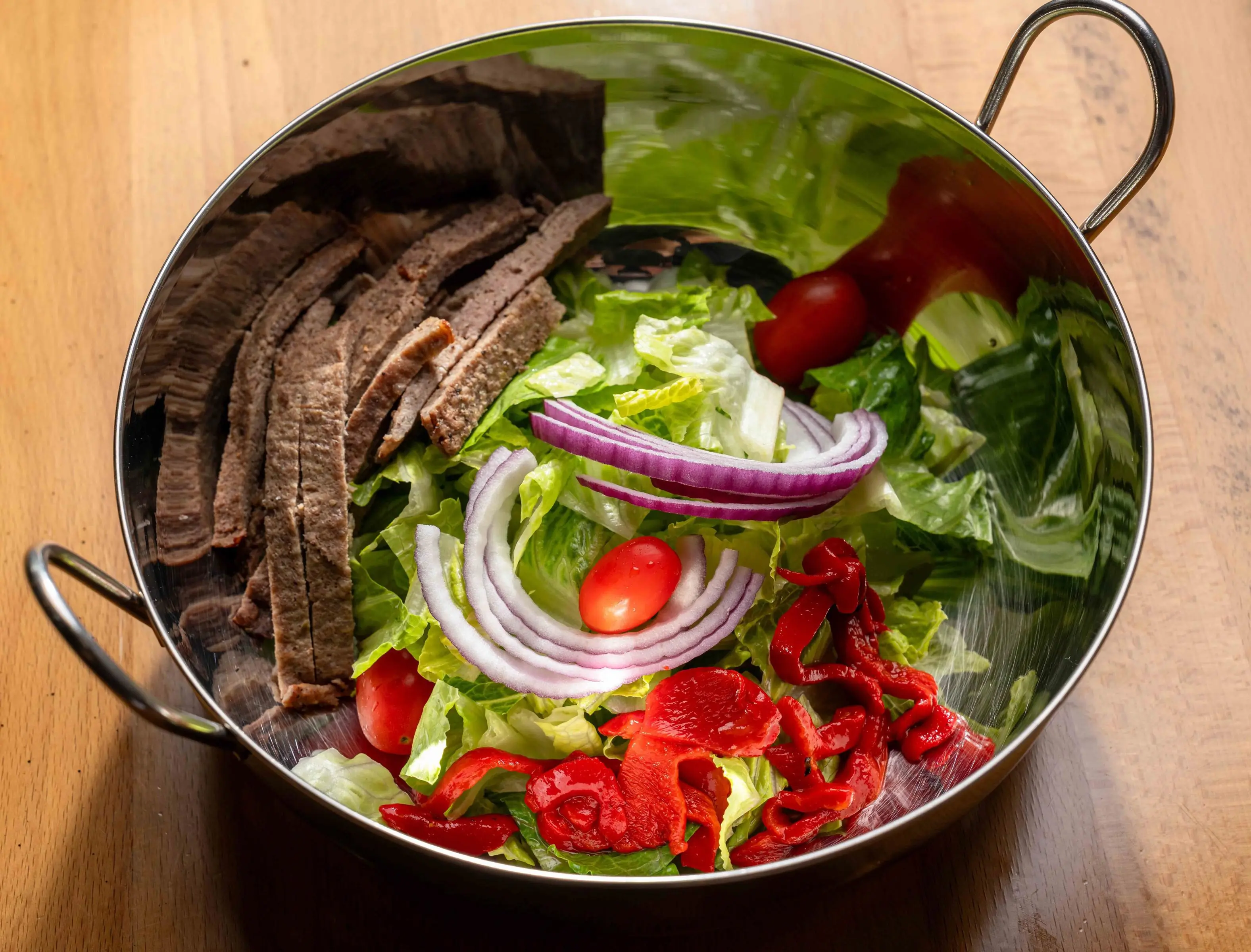 pulled beef steak, tomatoes, roasted red peppers, red onions & romaine lettuce tossed with ranch dressing